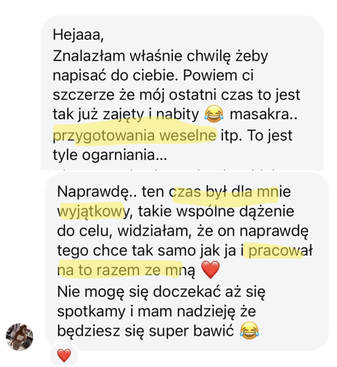 Pierwsze efekty poczujesz często już po pierwszym tygodniu – np. większy spokój, jasność w myślach, świadomość swoich granic. Głębsze przemiany przychodzą z czasem, bo pracujemy nad trwałą zmianą, a nie „motywacją na chwilę”.