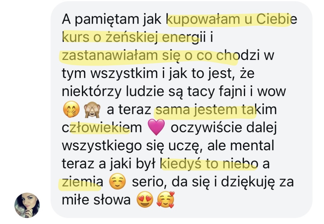 Setki kobiet takich jak Ty zaufały mi już – wyszły z poczucia niewystarczalności, odzyskały pewność siebie i zaczęły budować życie oraz relacje, w których czują się naprawdę WYBRANE. Teraz kolej na Ciebie.